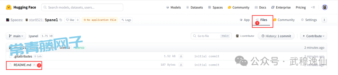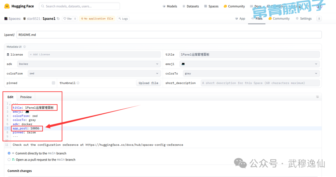 Space创建后,进入Space 工作台,点击【Files】,修改README.md 文件,点击README.md,点击 edit
