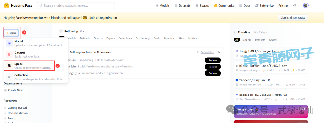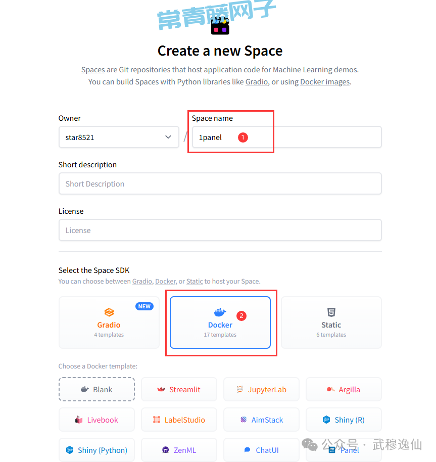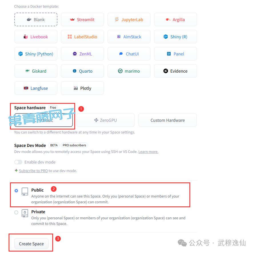 输入space name、Short description(可不填),选择Docker,Docker template 已默认选中了 Blank,可以不用改,Space hardware 现在也已经默认选中,也不用改;Public 也已默认选中,即可公网访问,也不用改。