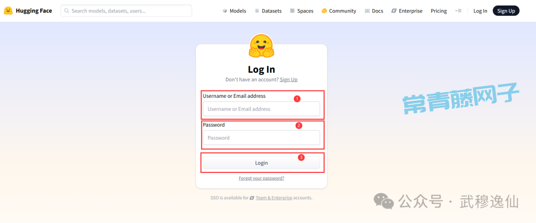 输入Username or Email address 和 Password 点击Login 登录到Hugging Face 。