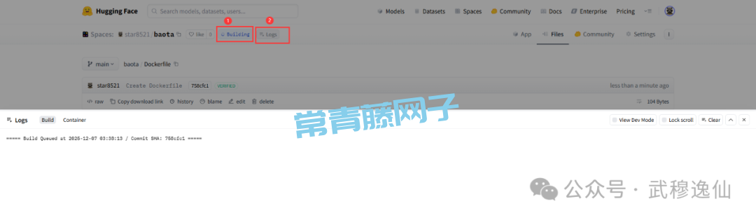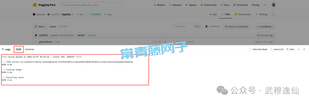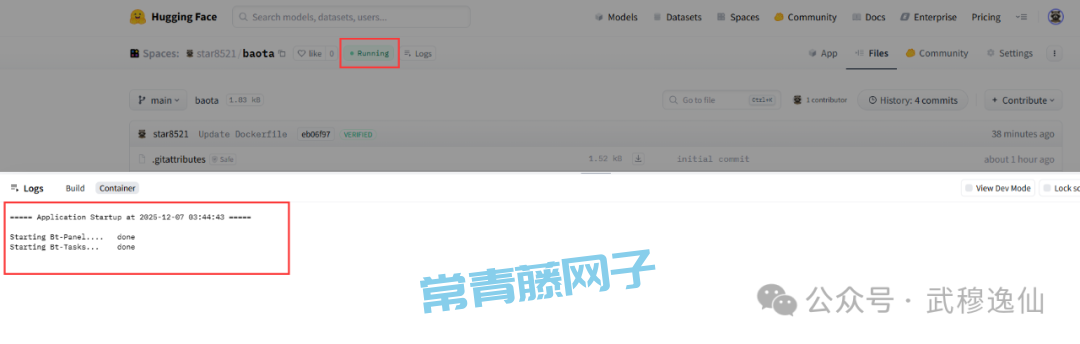 以上工作做完后,Hugging Face Spaces 会自动开始构建和部署宝塔面板。