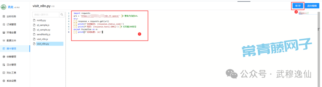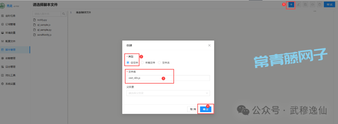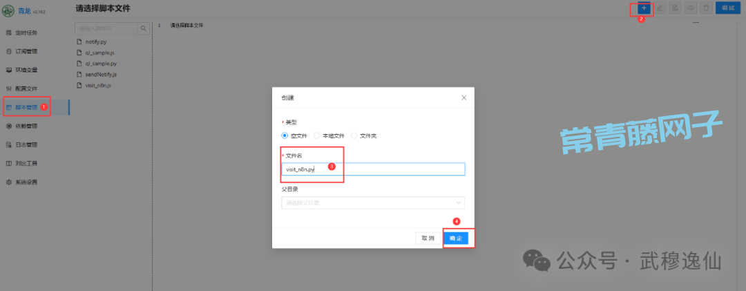 进入脚本管理(左侧菜单)。点击创建(右上角的+号),创建一个新的Python脚本文件(后缀.py),命名为visit_n8n.py(或任意名称)。