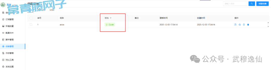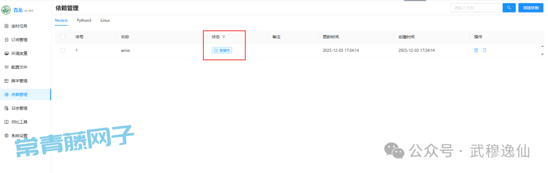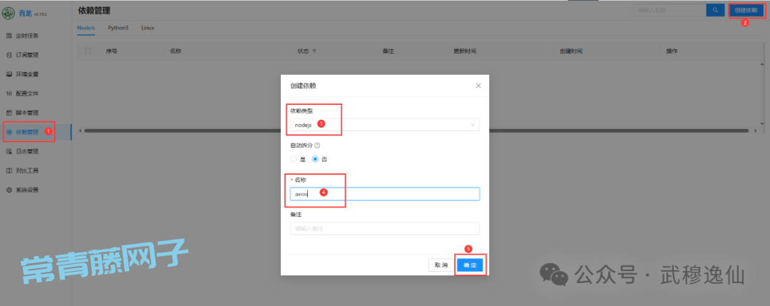 2、安装依赖(推荐用axios)进入依赖管理(左侧菜单),搜索并安装axios(或在脚本中用require('axios'))。
