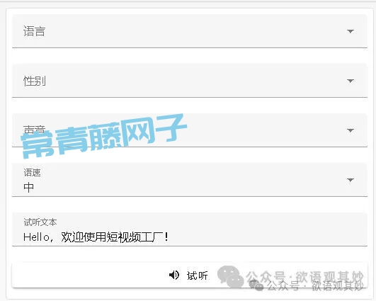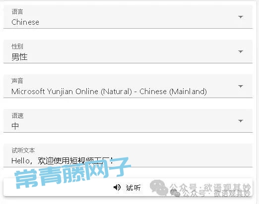 音频里面配置好语言,性别语速这些内容以后,可以点击试听看是否满意,用的TTS是微软免费的TTS,所以文字转语音部分是不需要花费费用的。