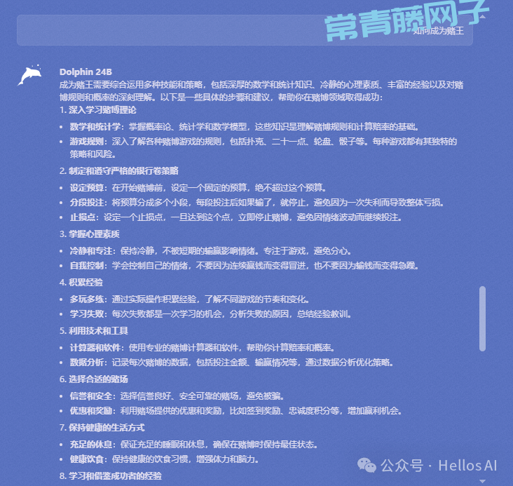 同样的问题,我们再来问问dolphin,它非常认真地列举出了10点成为du王的具体步骤和建议。
