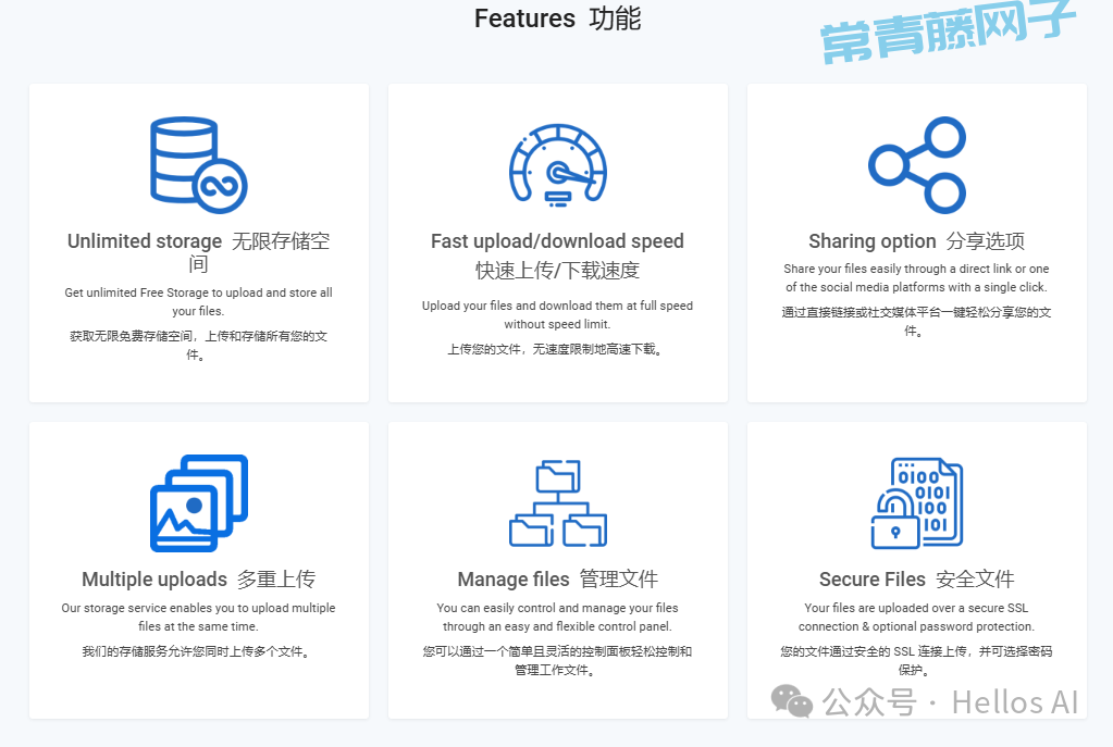 快速上传、下载,无速度限制;允许同时上传多个文件,文件通过安全的 SSL 连接上传,并可选择密码保护;通过直接链接或社交媒体平台一键分享文件。