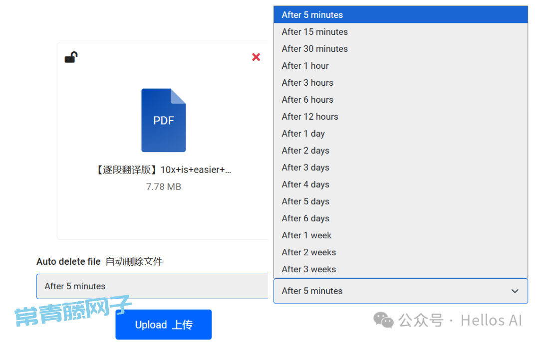 接着设置我们上传的文件自动删除的时间,点击“Auto delete file”下面的下拉框选择文件自动删除的时间,默认是5分钟后删除。这个根据自身需求设置。