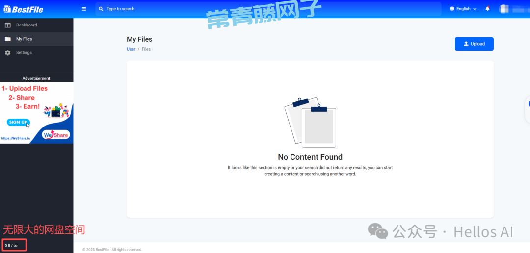 邮箱验证通过后进入BestFile的管理页面,可以看到网盘空间是无限大(不要太香,O(∩_∩)O哈哈~)。