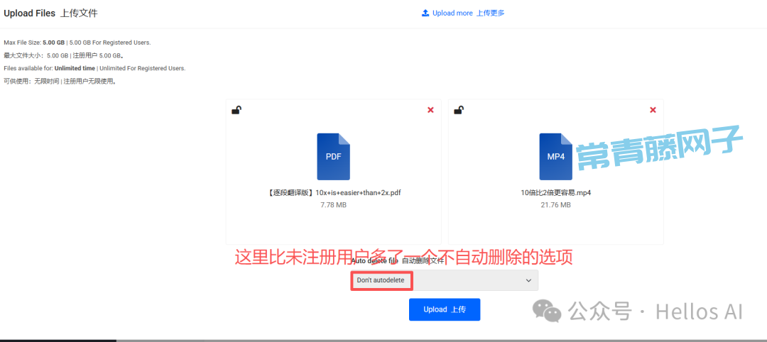 在自动删除文件选项中多了文件保存时长1~6个月和不自动删除的选项。也就是说注册用户可以永久保存文件。