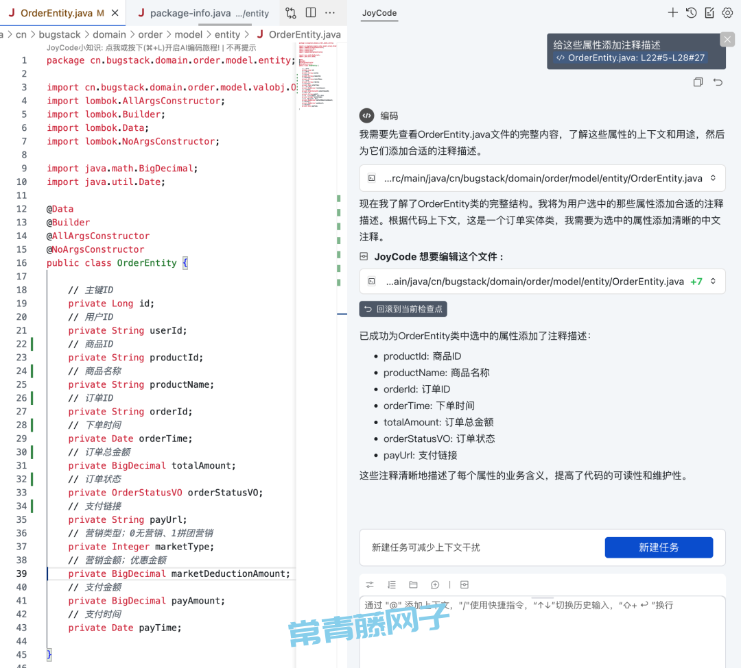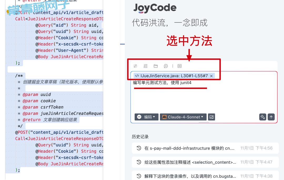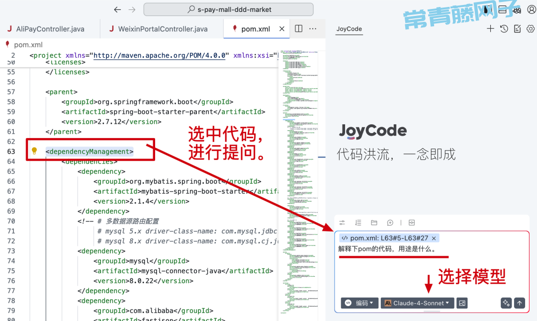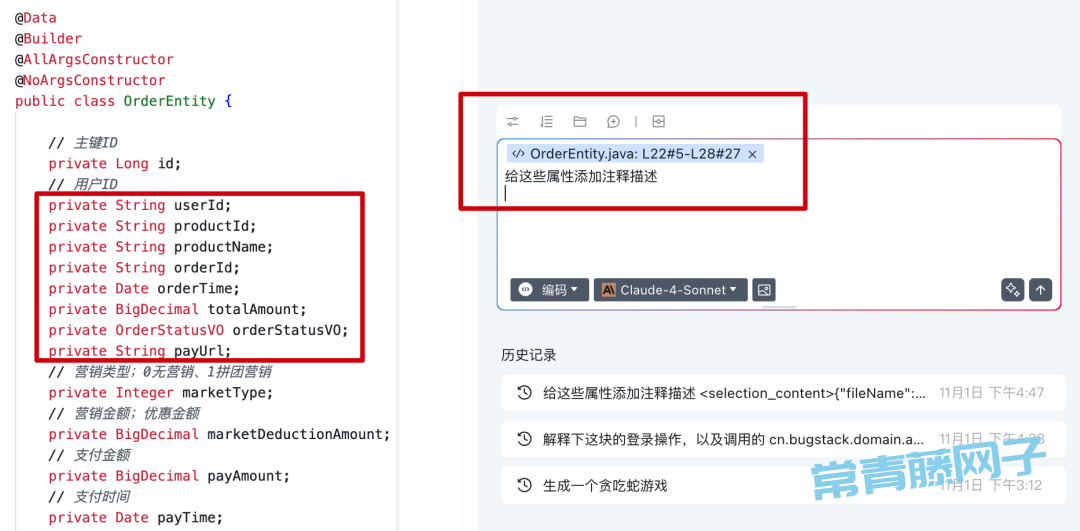 对于类、方法、字段属性,都可以让 AI 来补全注释说明,辅助我们学习使用。如果你对某一快逻辑厘不清的时候,也可以使用 AI 这样理解代码。