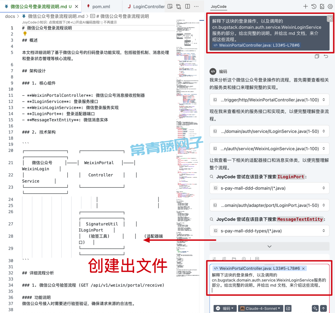 对于需要的代码进行选择式的提问,选中后的代码,在对话框中会标注出来。如果你在对话中还要告诉AI用其他部分的代码,则把对应位置的代码,写到对话框里就可以,如;cn.bugstack.domain.auth.service.WeixinLoginService
