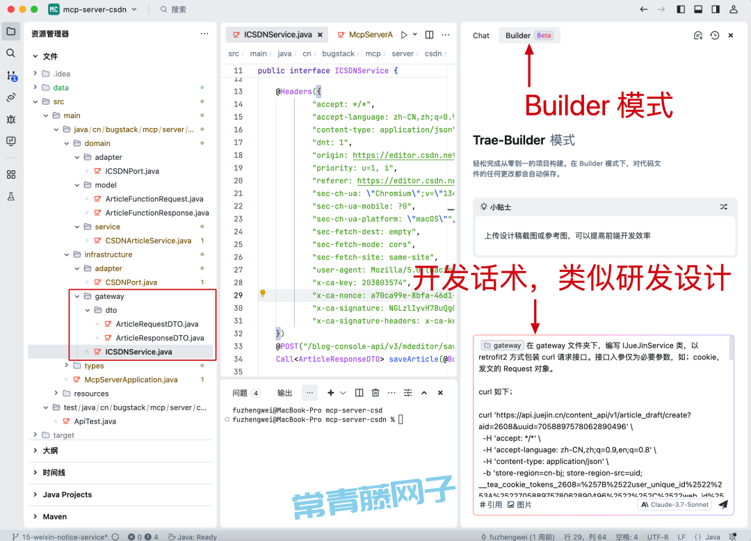 在 s-pay-mall-ddd-infrastructure 模块下, cn.bugstack.infrastructure.gateway 文件包下,编写 IJueJinService 类,以 retrofit2 方式包装 curl 请求接口。接口入参仅为必要参数,如;cookie,发文的 Request 对象。