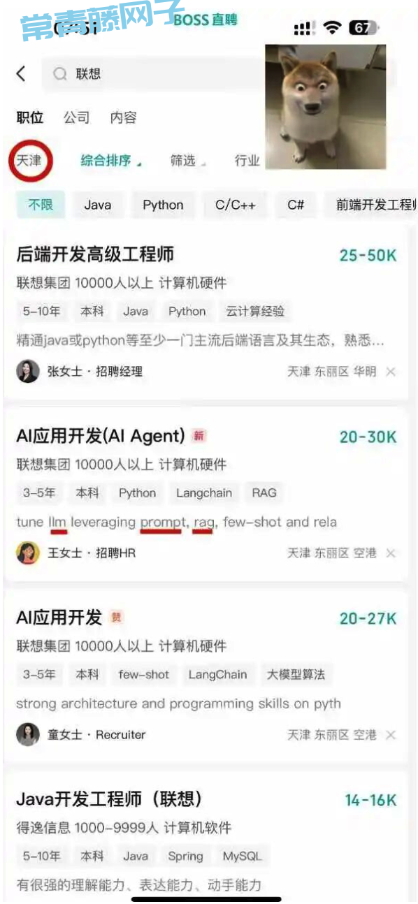你会在各个公司的招聘里看到 AI 应用开发岗,我以后也是会回天津的,顺手搜了下。附近就有联想公司的这样的岗位。早点储备能力!