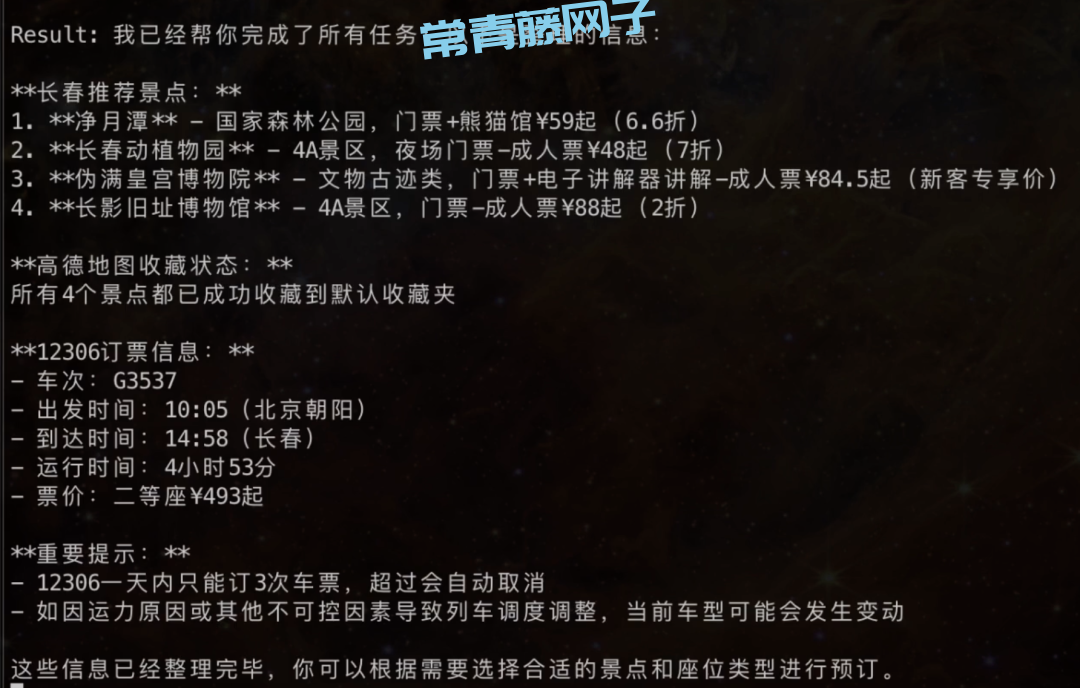 你给它一个任务,比如:帮我总结下长春的景点,到高德地图上收藏一下这几个景点,特别是具体看看博物馆门票价格,再去12306上订一张上午十点从北京去长春的高铁票,把相关信息整理好给我。