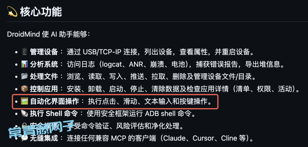 你直接用最聪明的 Claude 或 Gemini,通过 DroidMind 这个翻译官,直接操控你的安卓手机。