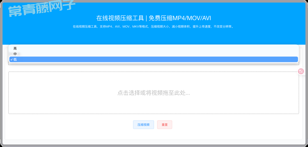 最常用的视频压缩功能,上传视频选择压缩质量,一键搞定。