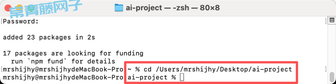 - 不要回车,直接用鼠标把你刚建的那个文件夹拖拽到终端里,它会自动生成路径。