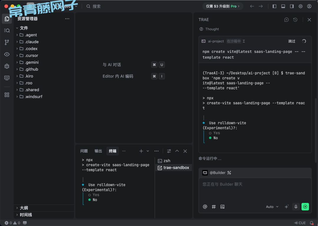 只不过Gemini Pro是收费的,用Trae的话是免费的,没怎么了解这个软件,但是我今天使用下来,用Trae用到后面需要排队挺久的。