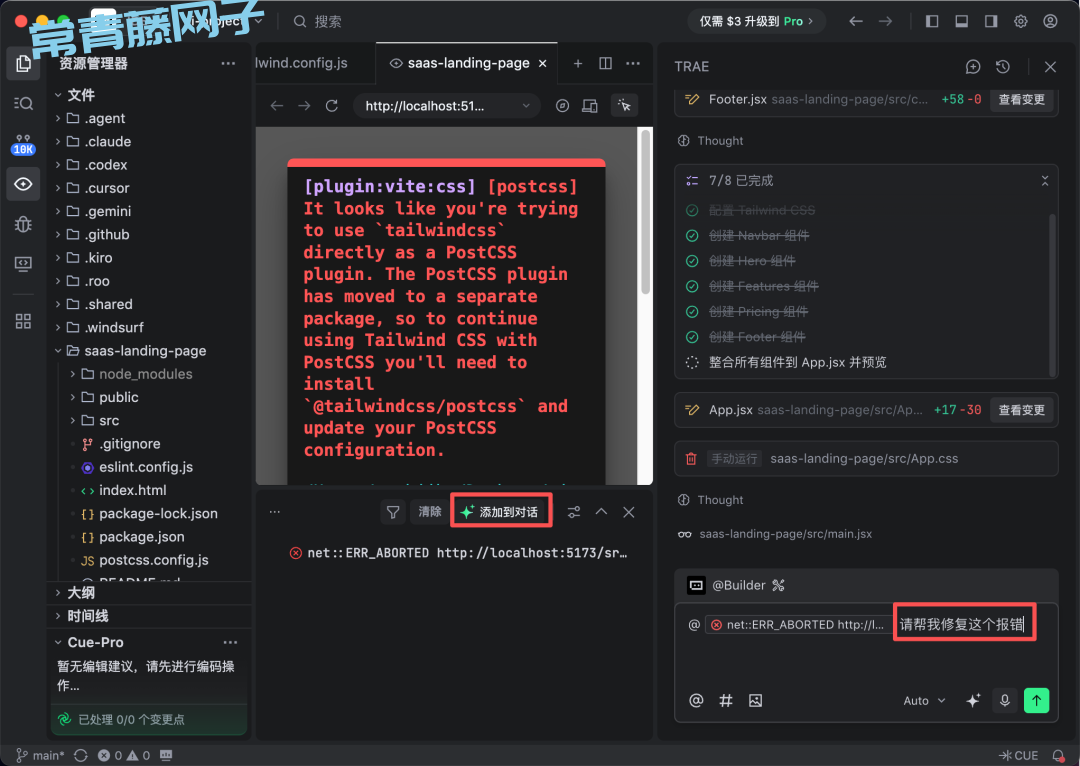 如果出现这个报错,就点击【添加到对话】,对话框输入【请帮我修复这个报错】