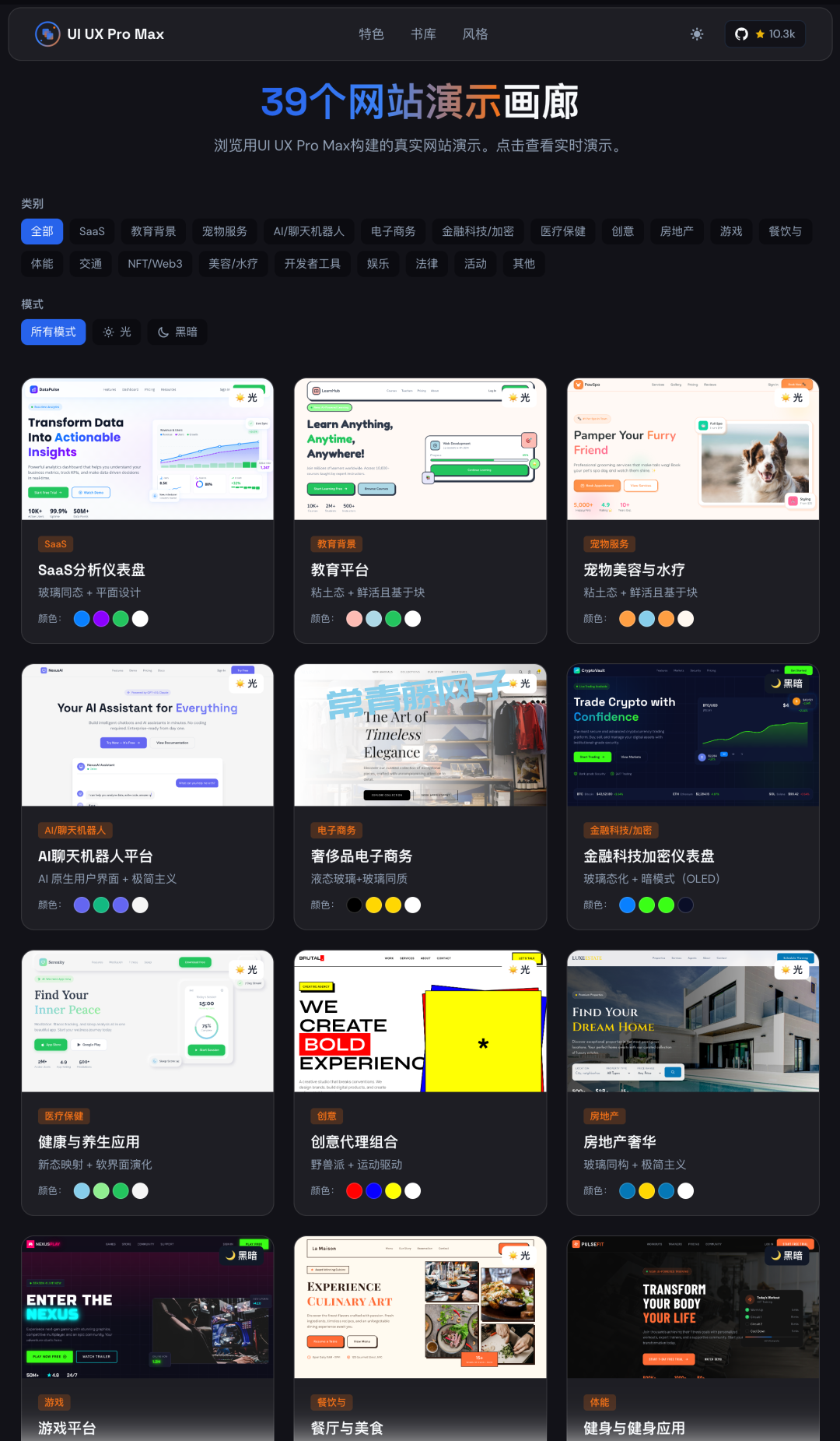 这个项目非常厉害,它整理了58种现代UI/UX设计风格,包含每种风格的专业数据、配色方案、使用场景等信息。