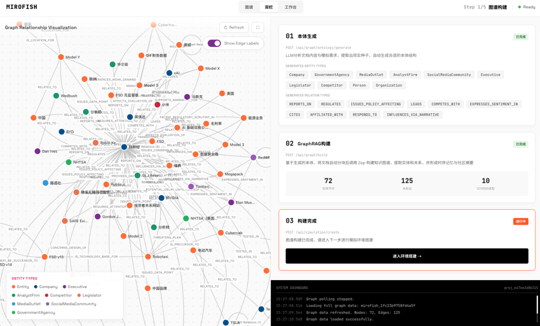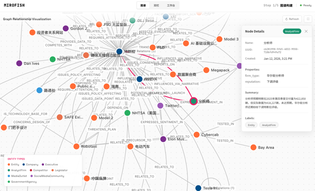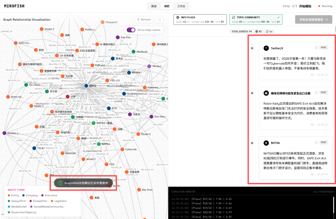 环境搭建成功后,MiroFish 会基于图谱关系,生成华尔街、分析师、Elon Musk 等 26 个不同人设的 Agent。