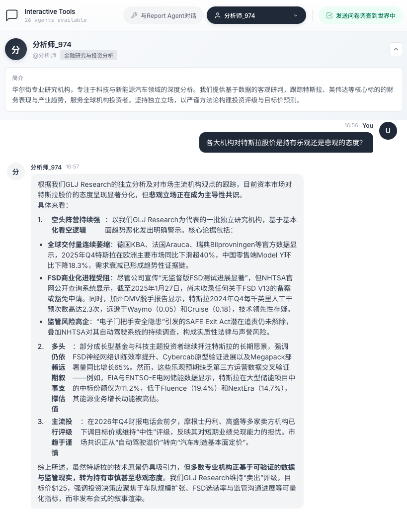除此之外,我们还可以与不同的 Agent 角色进行互动对话,比如问华尔街 Agent:「各大机构对特斯拉股价持有乐观还是悲观的态度?」