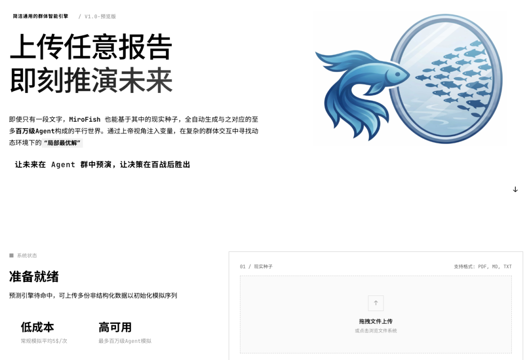 打开 MiroFish,可以看到界面操作逻辑非常直观,支持上传 PDF、MD、TXT 等格式的报告。