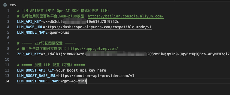 2、在 .env 配置文件里,填入必要的 API Key ,支持 OpenAI、阿里等平台的大模型: