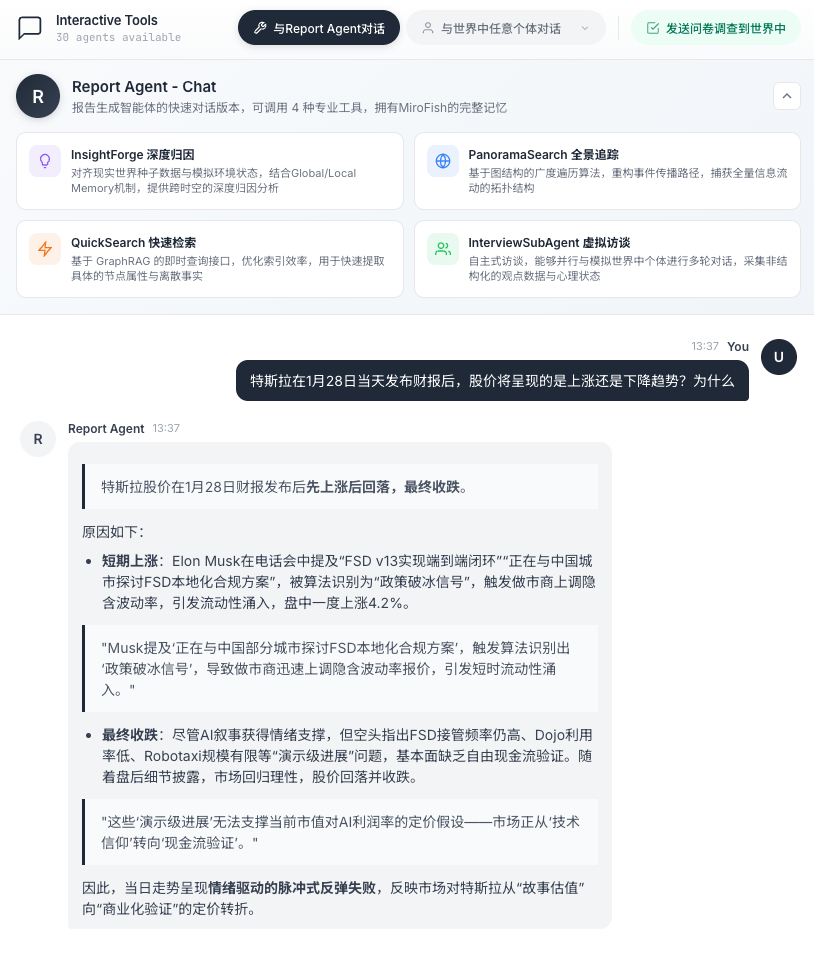 进入到互动环节,与 Report Agent 深入对话,让它一句话为我们总结结果:
