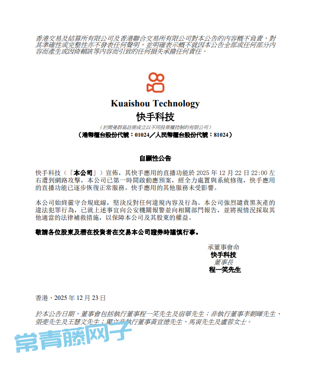 快手应用的直播功能于2025年12月22日22:00左右遭到网路攻击,公司已第一时间启动应预案,经全力处置与系统修复,快手应用的直播功能已逐步恢复正常服务。快手应用的其他服务未受影响。