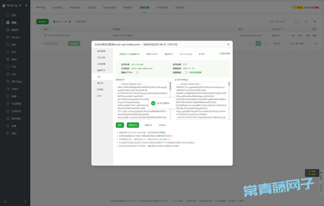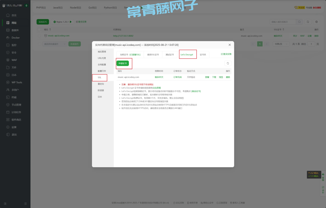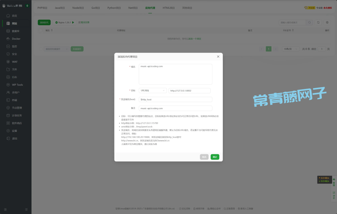 进入 网站 -> 反向代理 -> 添加反代 ,填入一个你自己的域名,如果没有域名的话,可以去购买一个