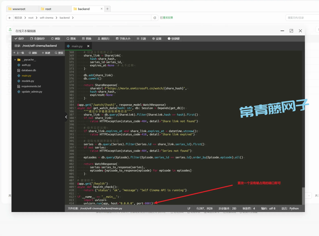 在这一步如果提示找不到某个依赖,点击 操作 中的 终端 ,自行输入 pip install xxx(包名) 即可,若提示端口被占用 (更改一个没有被占用的端口即可 main.py )