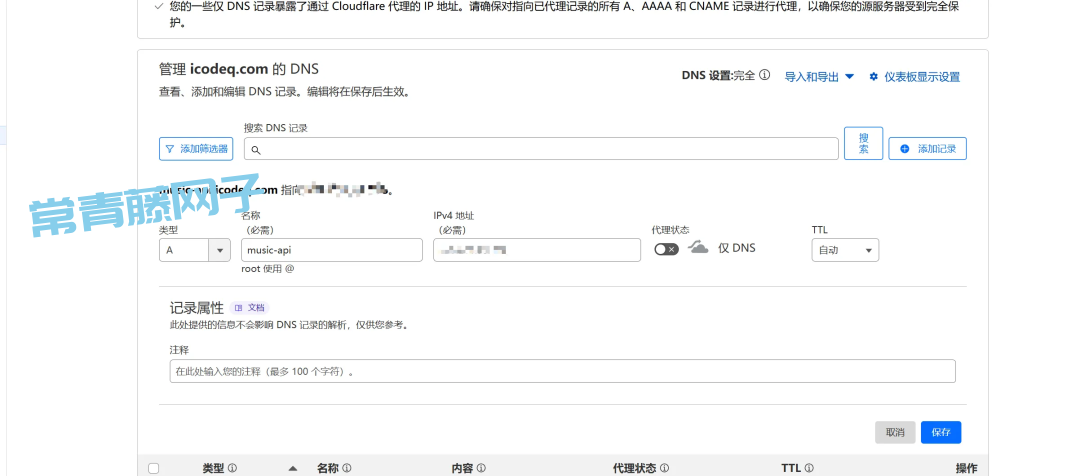 然后在这里填入你要绑定的 API 域名,在这里使用 music-api.icodeq.com