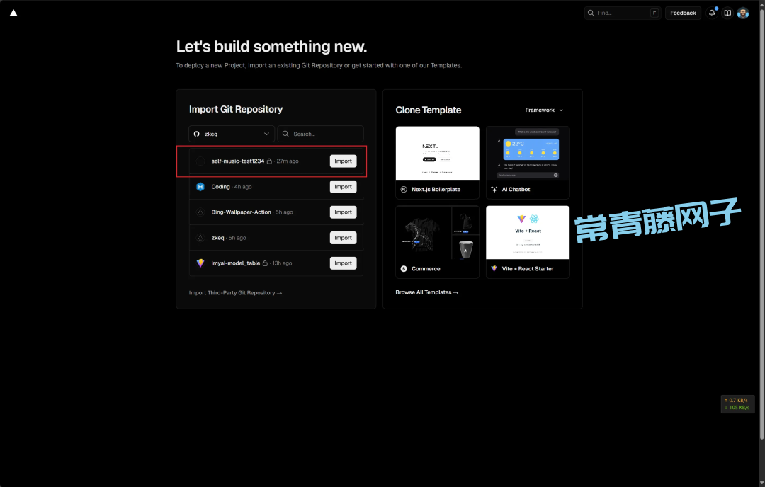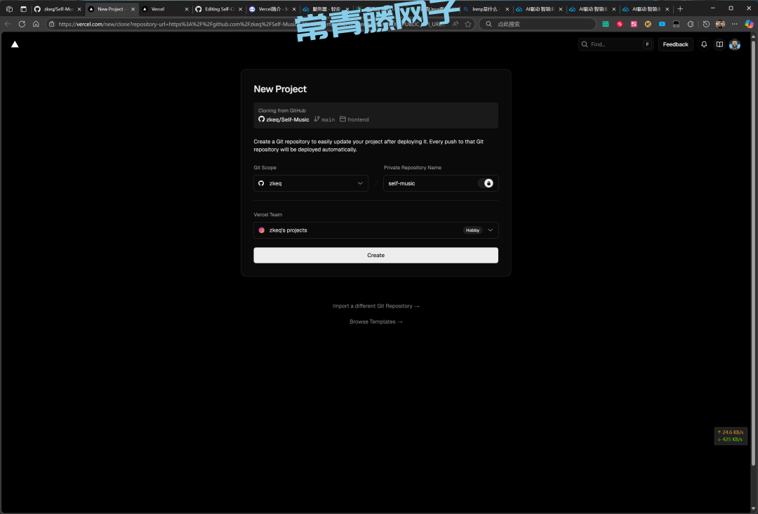 如果你有自己的动手能力,想要对源码进行二次开发,点击Vercle 页的 fork 按钮后,点击Create fork,就可以将仓库导入你的名下相当于开启一个副本分支)