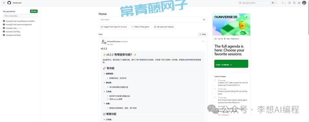 全球的程序员基本上都会把自己的代码托管到 Github 上,公开仓库完全免费,有数千万的开发者和社区,包含海量优质的开源代码,是我们做 AI编程必须注册和使用的平台。