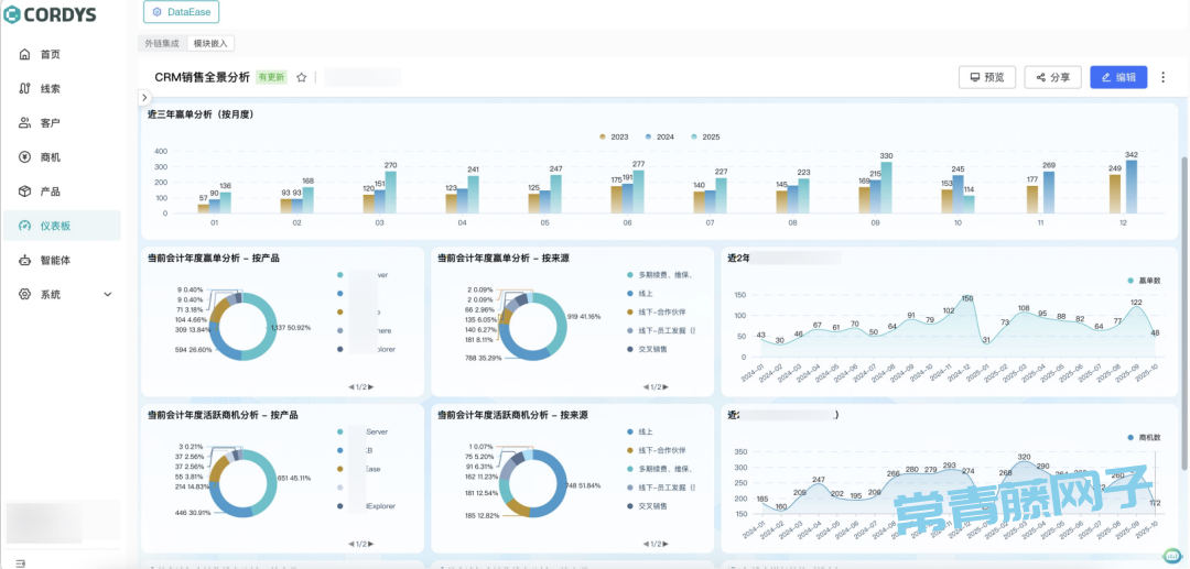 CordysCRM 融合 DataEase 与 SQLBot 的强大能力,对一销售数据进行可视化呈现、进行自助分析。