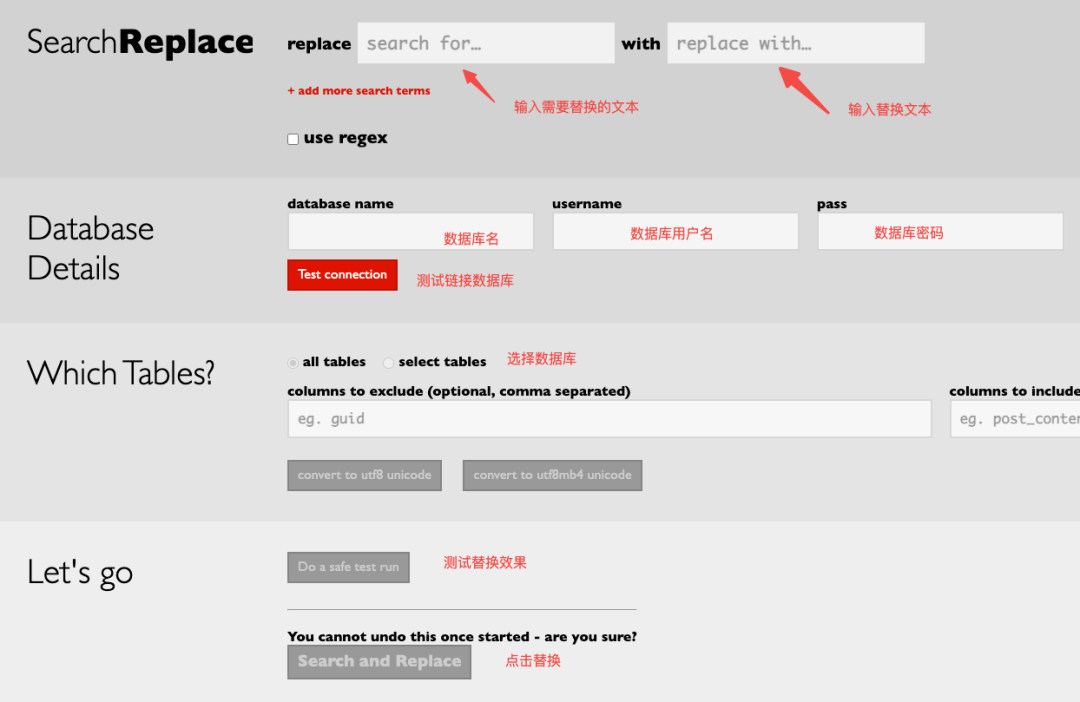 ◦从github下载zip,上传到网站根目录解压◦访问根目录SRD所在文件夹◦填写数据库名、用户名、密码测试链接数据库直到成功◦输入查询文本和替换文本◦选择数据库,一般就选择两个wp_posts和wp_postmeta◦点击「Do a safe test run」,查看替换文本位置◦确认替换的没问题了再点击「Search and Replace」最终替换