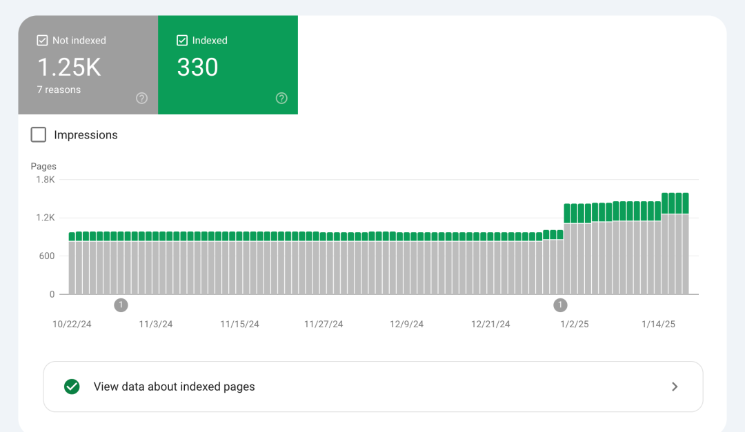 上图就是google search console展示的收录比,灰色比绿色多太多,网站就危险了!