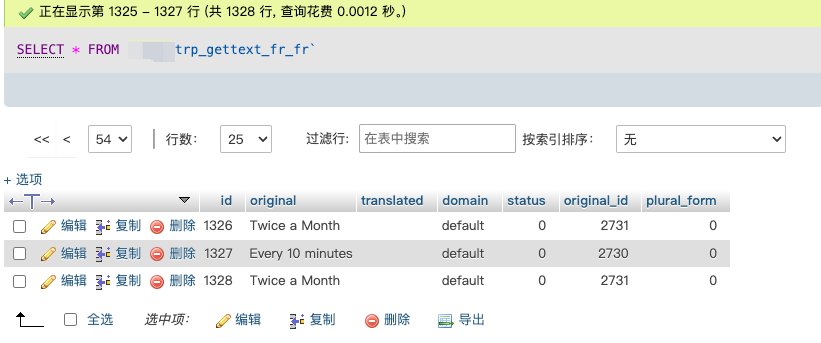 为什么tp如此高效,因为tp会自动爬取网站的词条存到对应的wp_trp_gettext_xx 数据库里面。