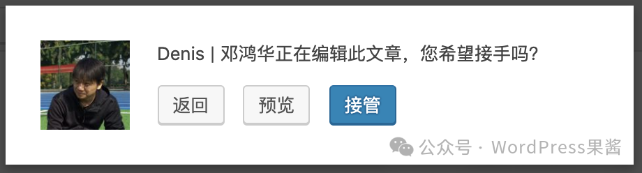 这个就是 WordPress 的文章编辑锁定功能,提示当前谁在编辑这篇文章,如果继续点击进去,WordPress 会再次提示如下的信息:
